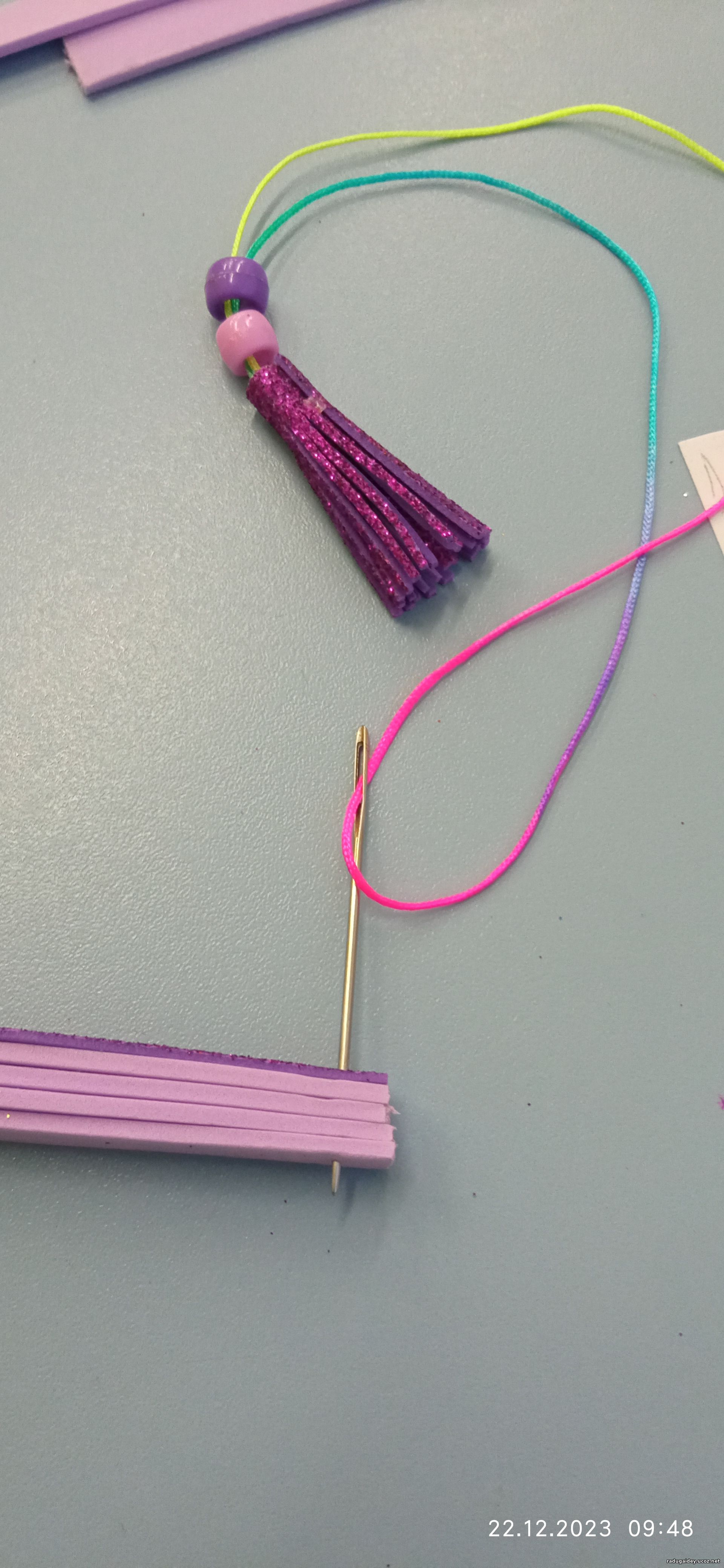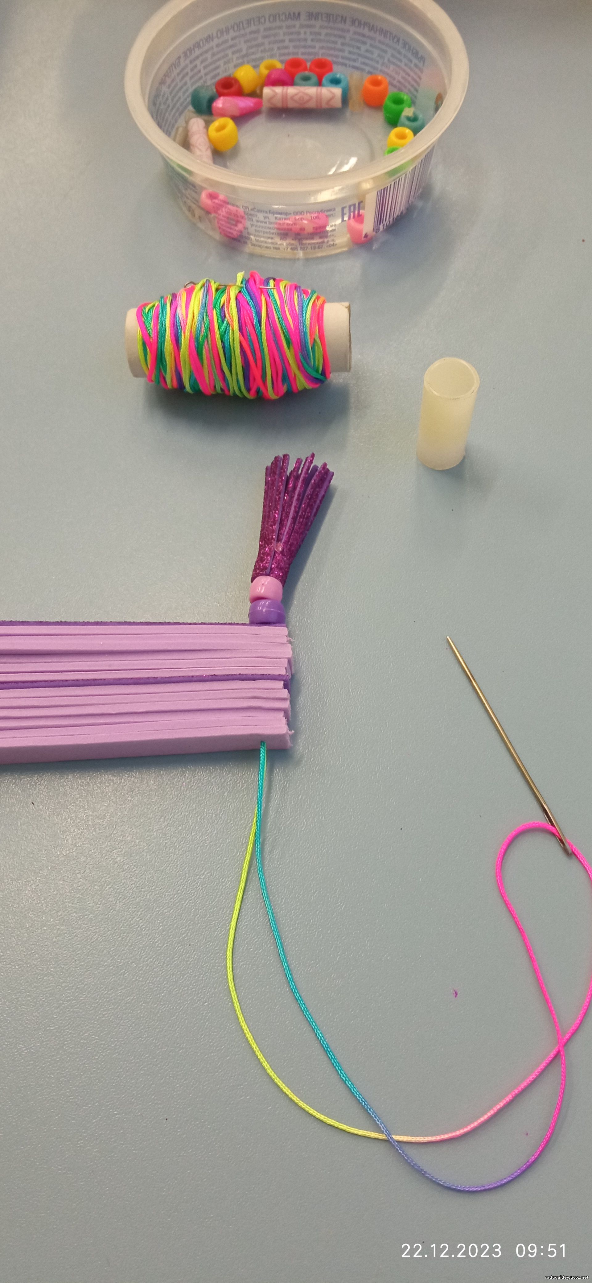 Приступаем :Квадратик 3х3 надрезаем с одного края соломкой, для изготовления кисточки, веревочку продеваем в иглу, делаем узелок и фиксируем клеем на ненадрезанном уголке квадратика, далее скручиваем в трубочку- кисточка готова.