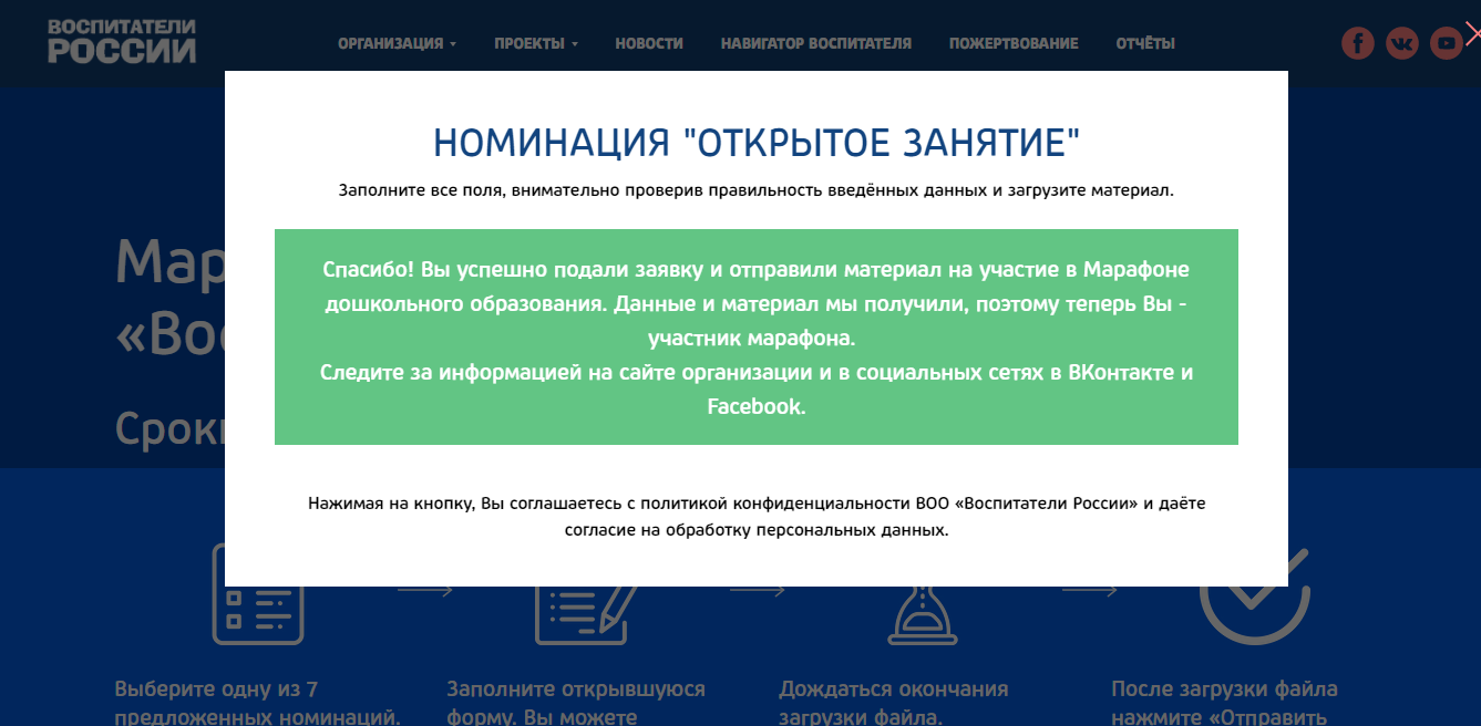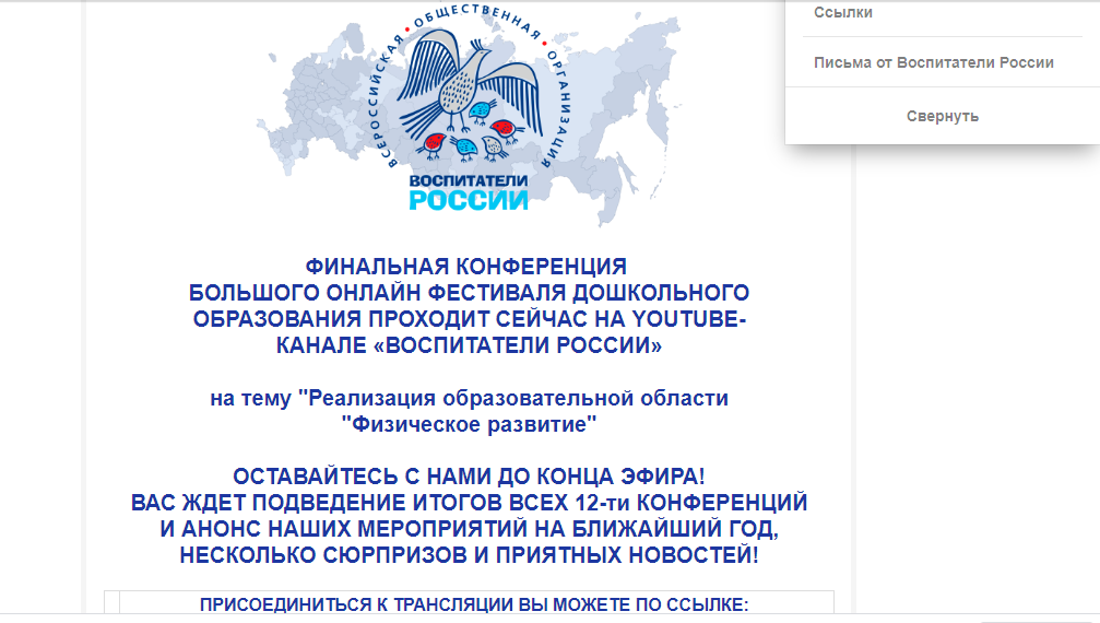 В июне 2020 года Всероссийская Общественная Организация "Воспитатели России" проводила большой онлайн фестиваль.Он проходил на YOUTUBE канале на тему "Реализация образовательной области "Физическое развитие".