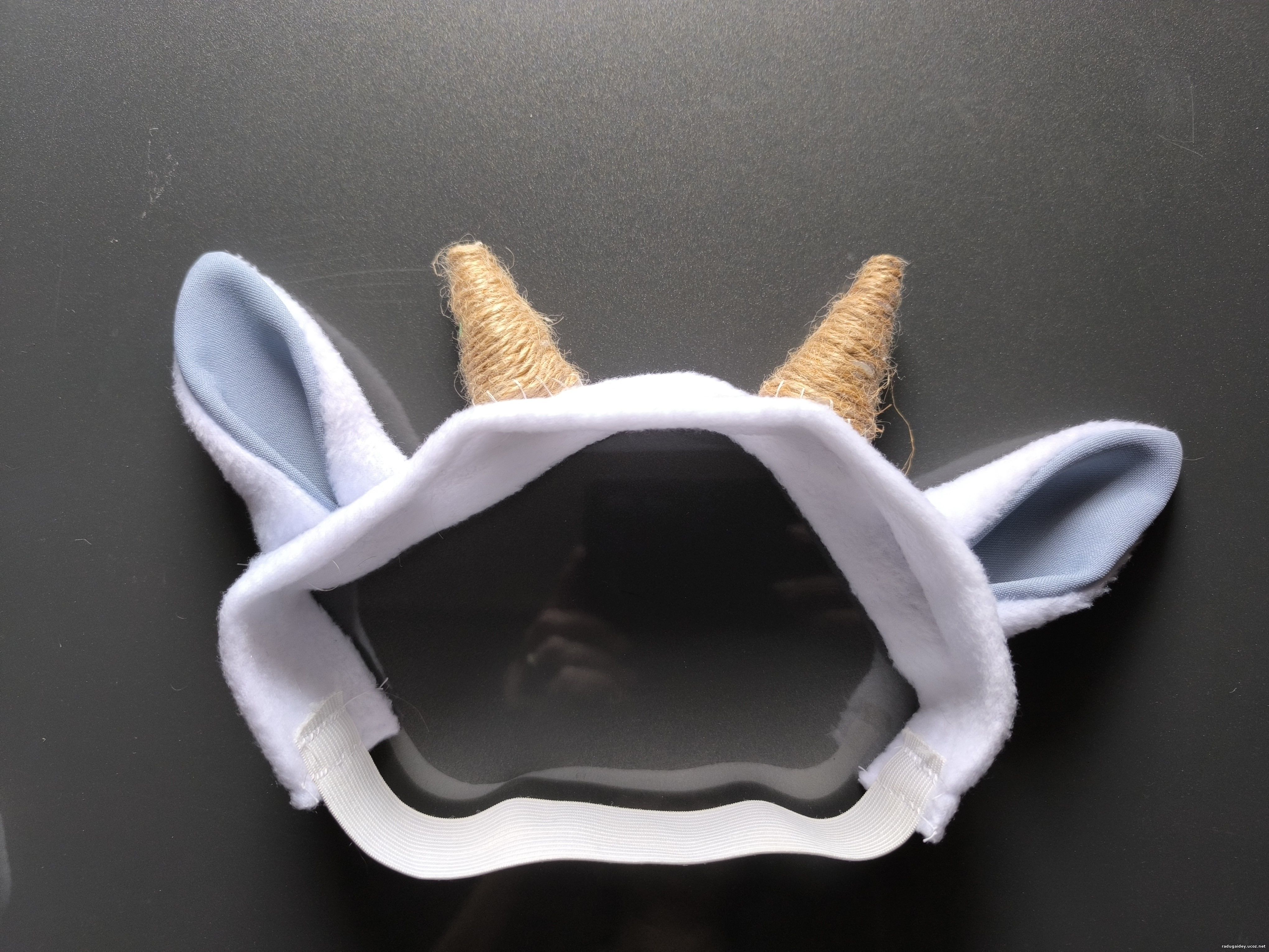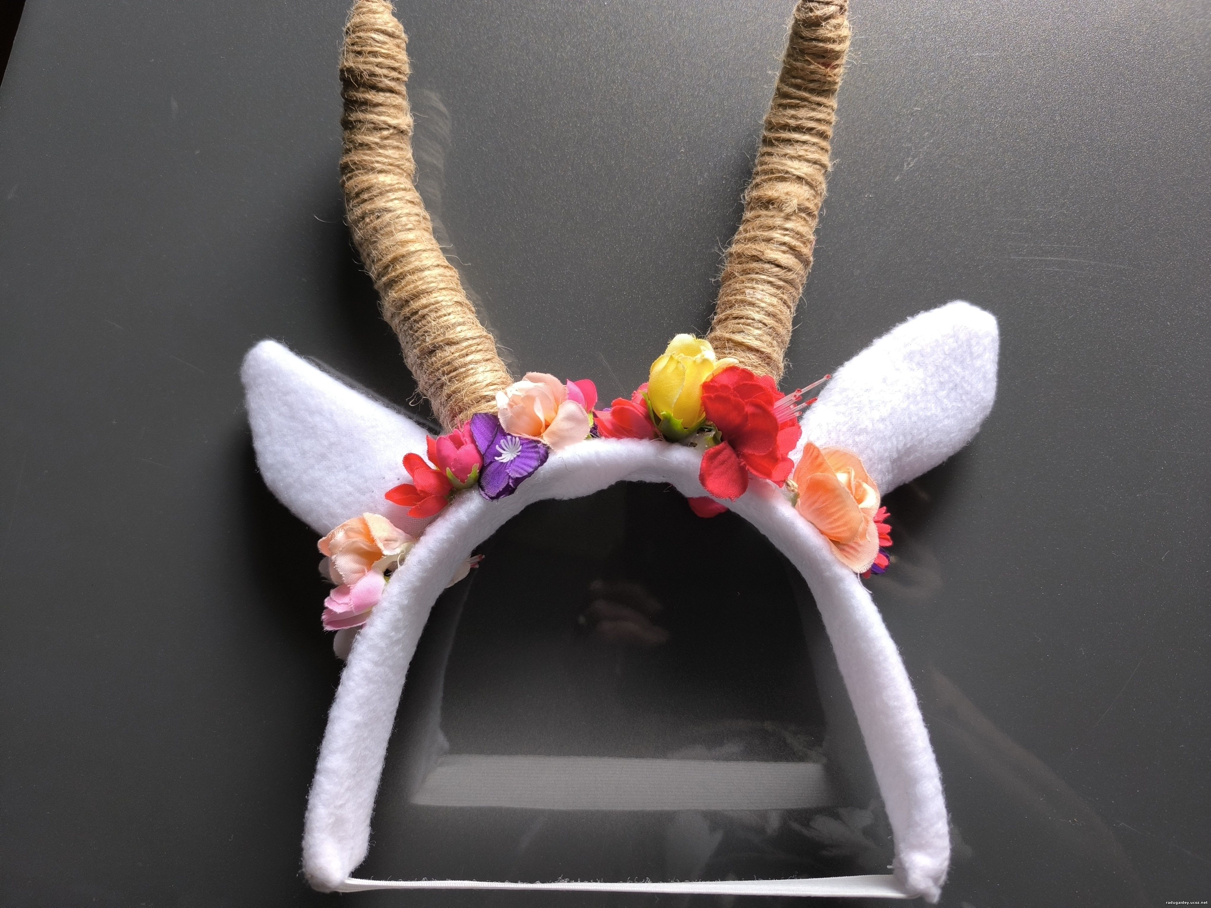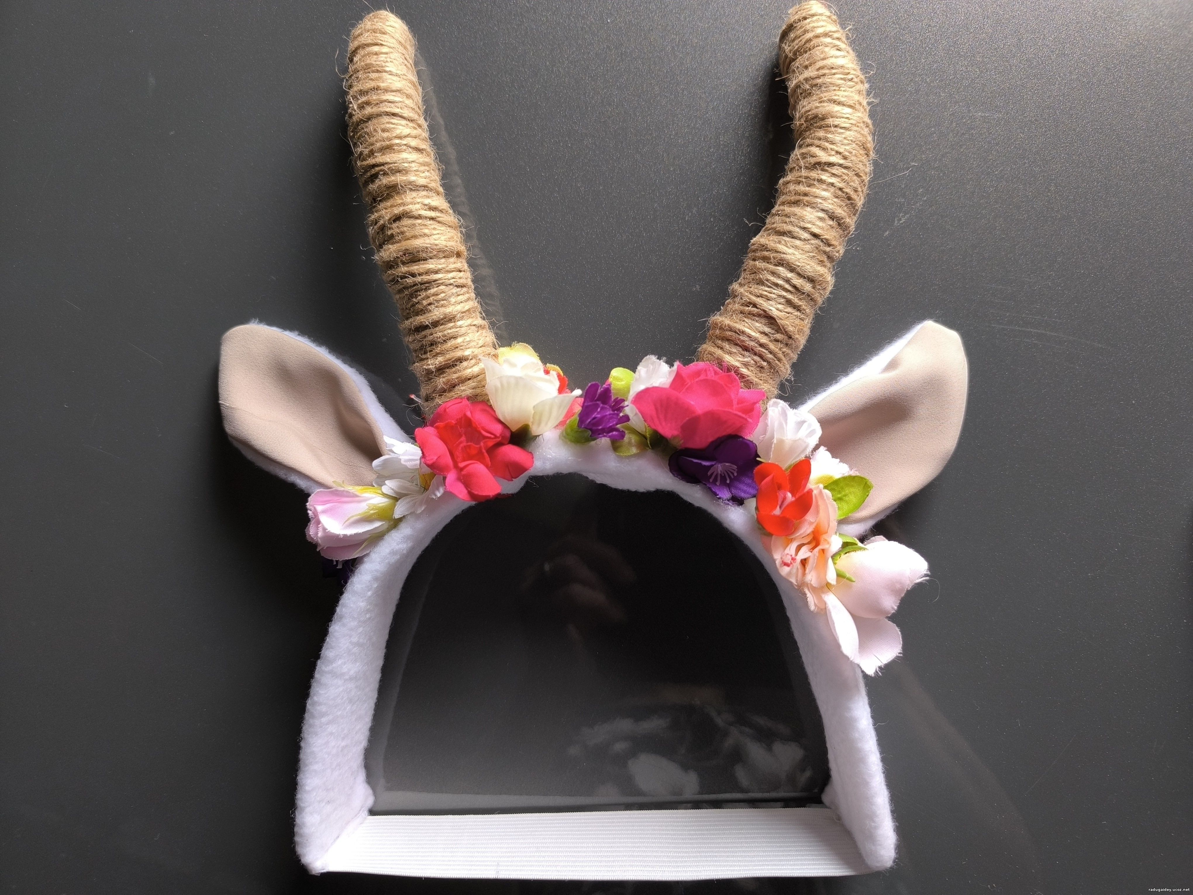 В основу самих рожек взят пенопласт, обмотан джутовым шнуром, обычный ободок на голову обтянула флисом и чтобы держался сзади пришила широкую резинку. Ободок козочке украсила готовыми цветочками.