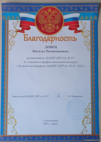 За участие в конкурсе " Лучший воспитатель МАДОУ ЦРР д/с 87" 2022-2023гг.